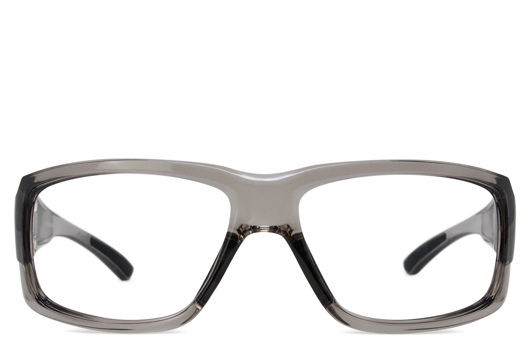 Translucent smoke grey TR-90 wrap frame with raised logos. complete with prescription lenses custom-made for you in our US-based optical lab. Includes signature hard case.