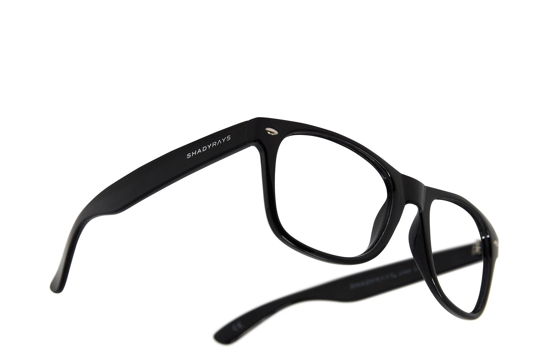Gloss black frame with polished metal hinges and metal Shady Rays emblem complete with prescription lenses custom-made for you in our US-based optical lab. Includes signature hard case.