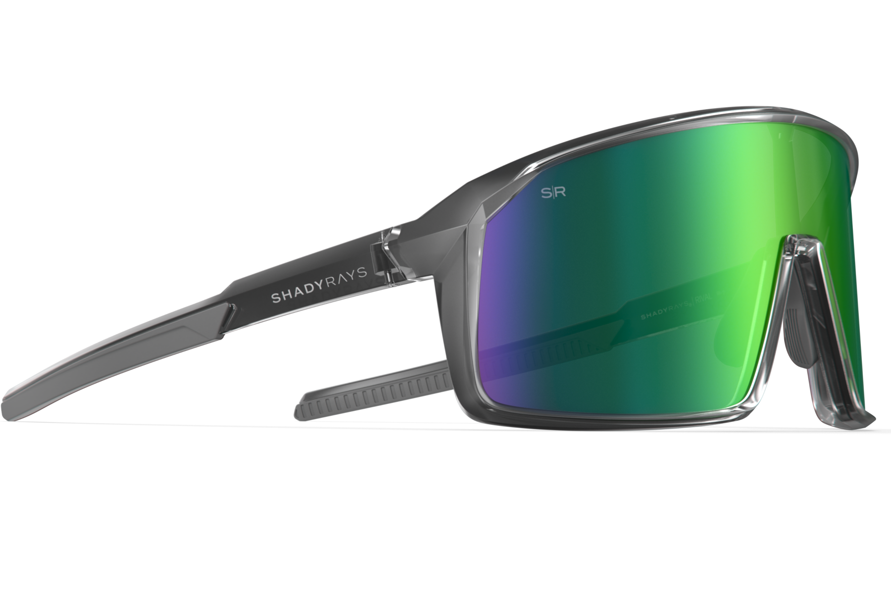 - Single lens design for a panoramic view. Premium Polarized Emerald Green mirrored lenses with gray tint: 100% UV protection / shatter-resistant /anti-scratch/ salt water resistant/hydrophobic