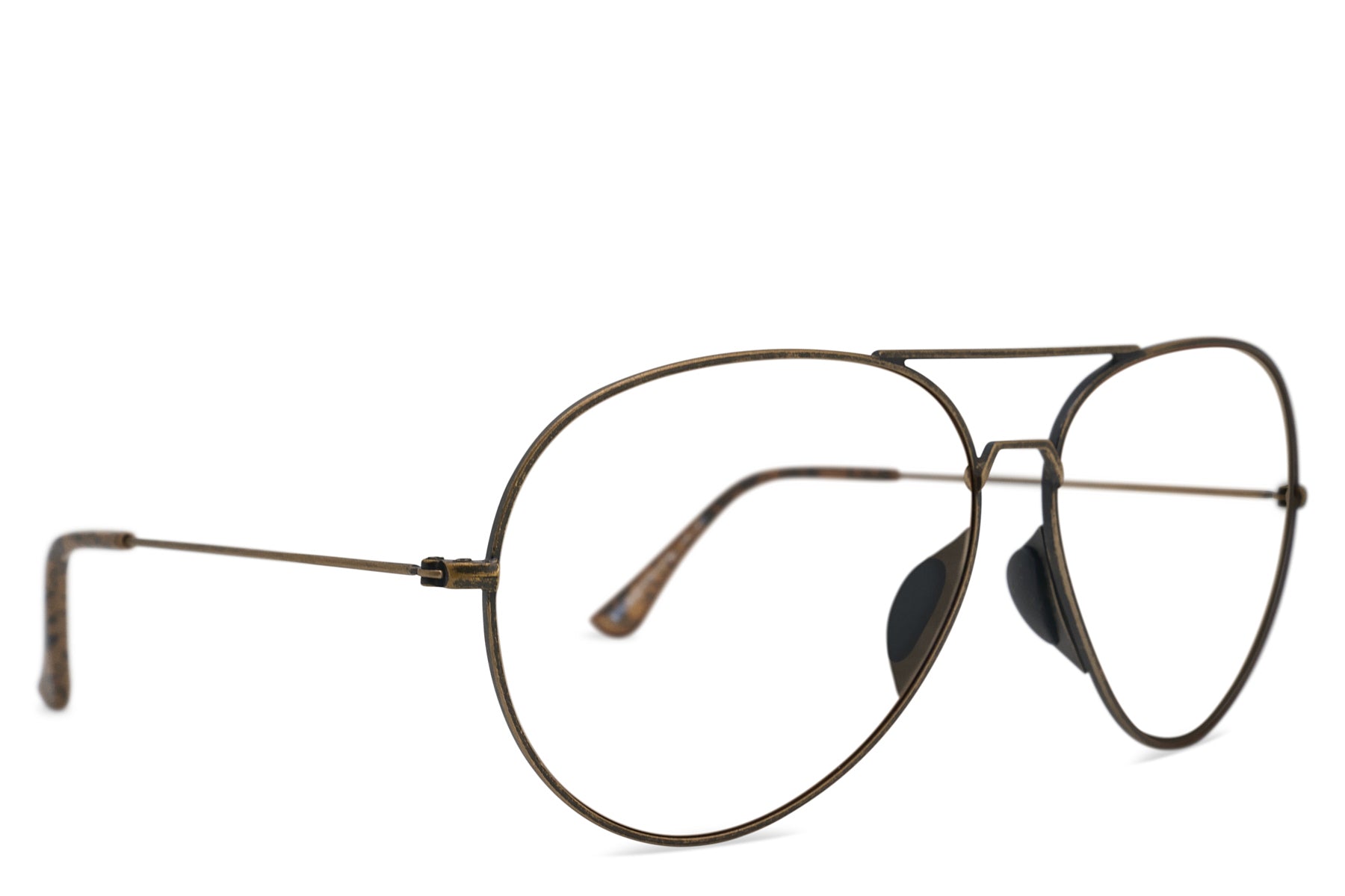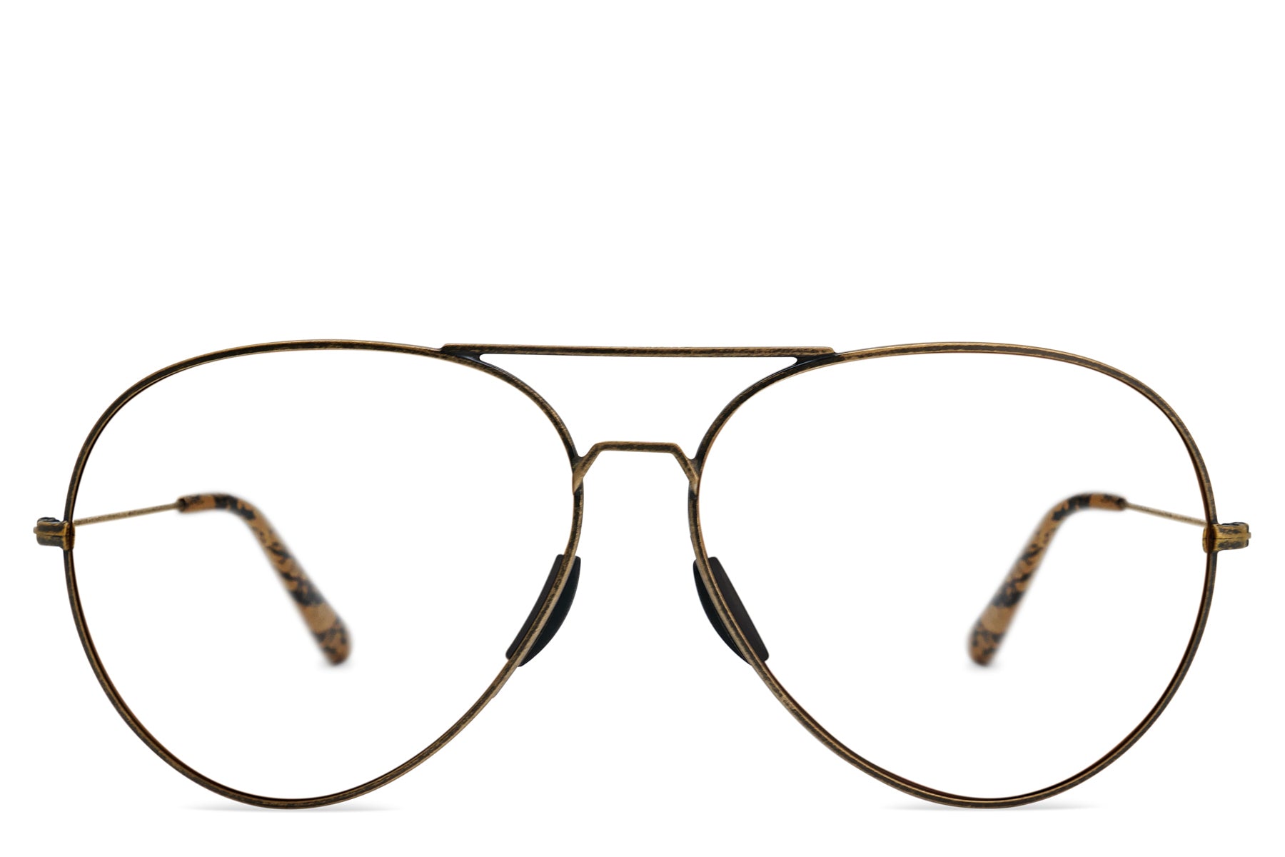 Ultra-Premium Antique gold metal frame. Aviator Frame with flex-fit arms. matte snakeskin temple tips. and comfortable nose pieces that won’t get caught in your hair. Complete with prescription lenses custom-made for you in our US-based optical lab. Includes signature hard case.