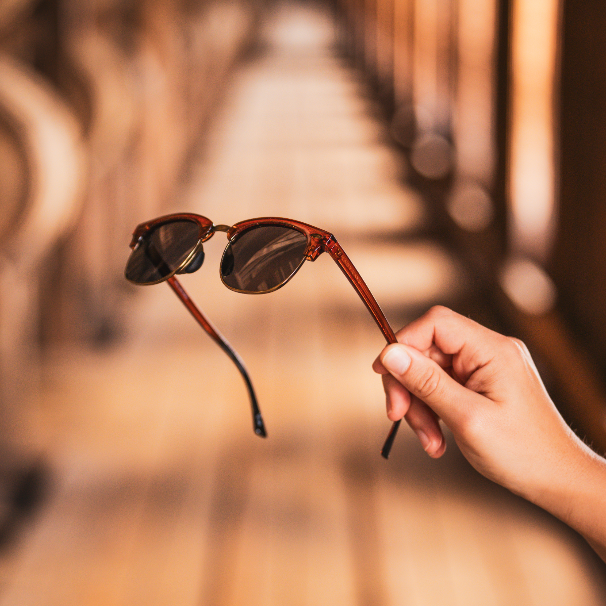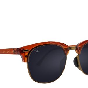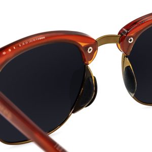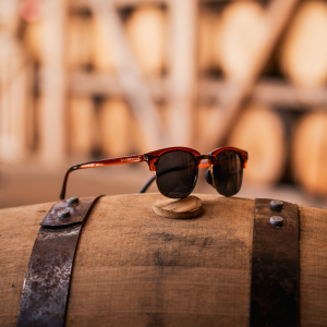 - Bourbon gloss frame with metal hinges. copper accents. and charred-barrel fade on temple tips
